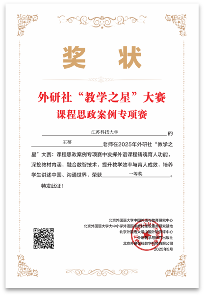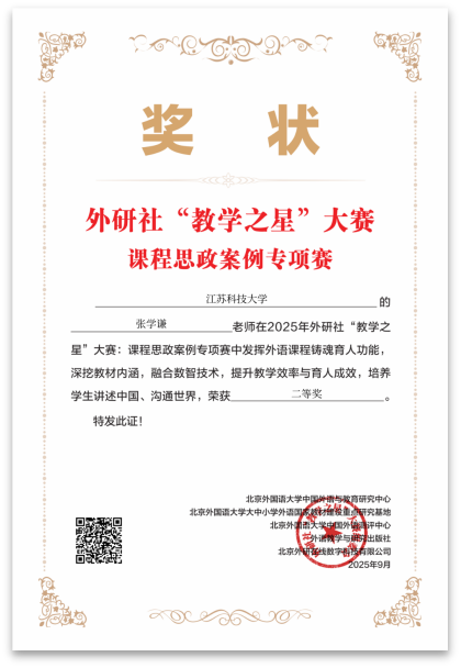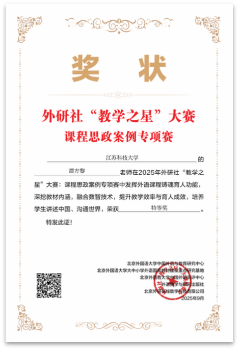 近日,2025年外研社“教学之星”大赛课程思政案例专项赛获奖名单正式公布。外国语学院多位教师凭借扎实的专业功底、创新的教学设计和深厚的课程思政育人理念,在主赛道中表现突出,取得历史性突破。蒋慧、谭方黎老师荣获特等奖;雷飞、曹莉、王蓓老师荣获一等奖;张学谦老师荣获获二等奖;吴丹娜老师荣获三等奖。无论从获奖数量、等级,还是参与人数来看,均创我院参加该赛事以来最佳成绩,也位居省内高校首位。