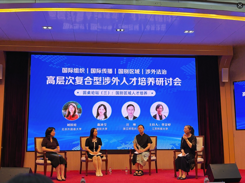 在圆桌论坛环节,我院院长曾景婷教授主持了“国别区域人才培养:聚焦专业建设和特色发展”第三论坛,与北京外国语大学区域与全球治理高等研究院院长刘铁娃、深圳大学外国语学院院长助理翁冰莹、浙江师范大学外国语学院副院长汪琳展开了深入交流,探讨了如何立足校本特色探索,发挥跨学科优势,实现差异化发展,探索服务国家战略需求的人才培养新路径。