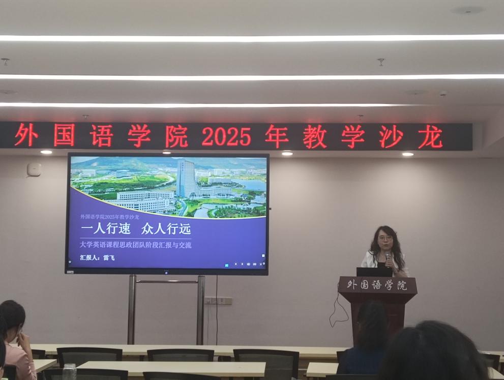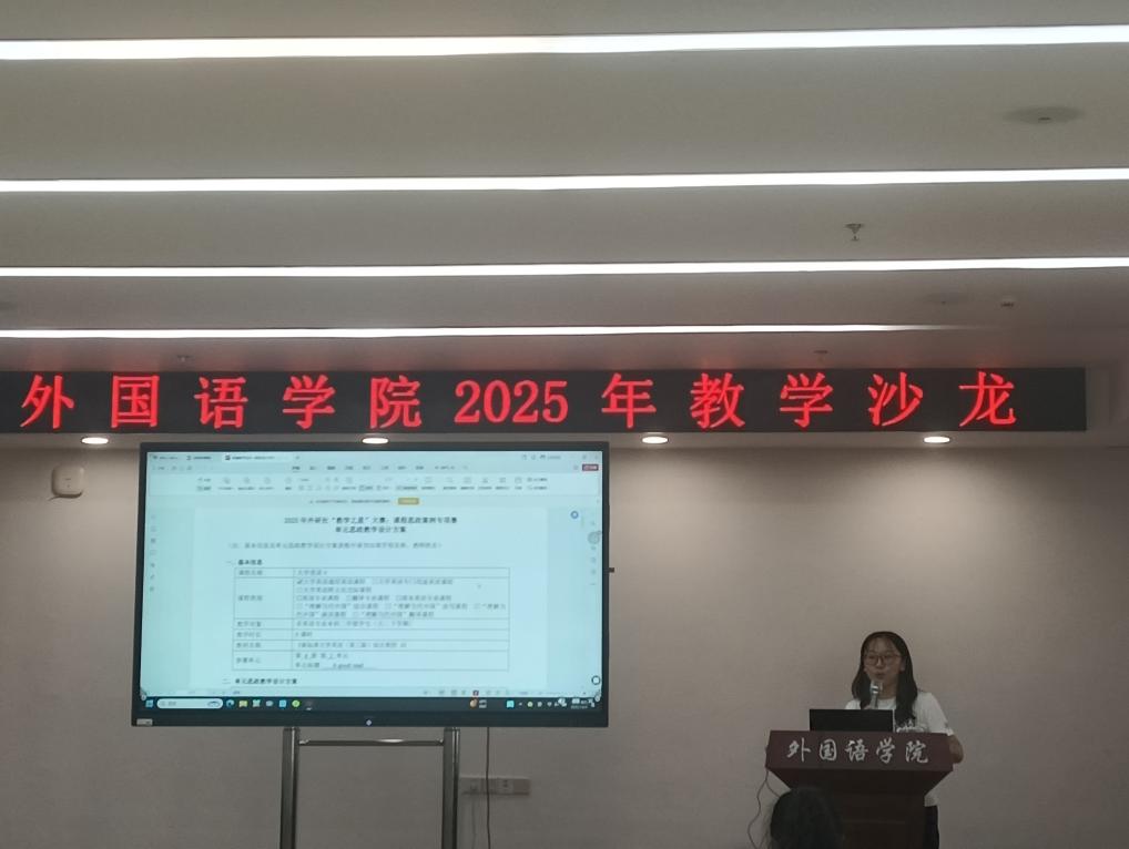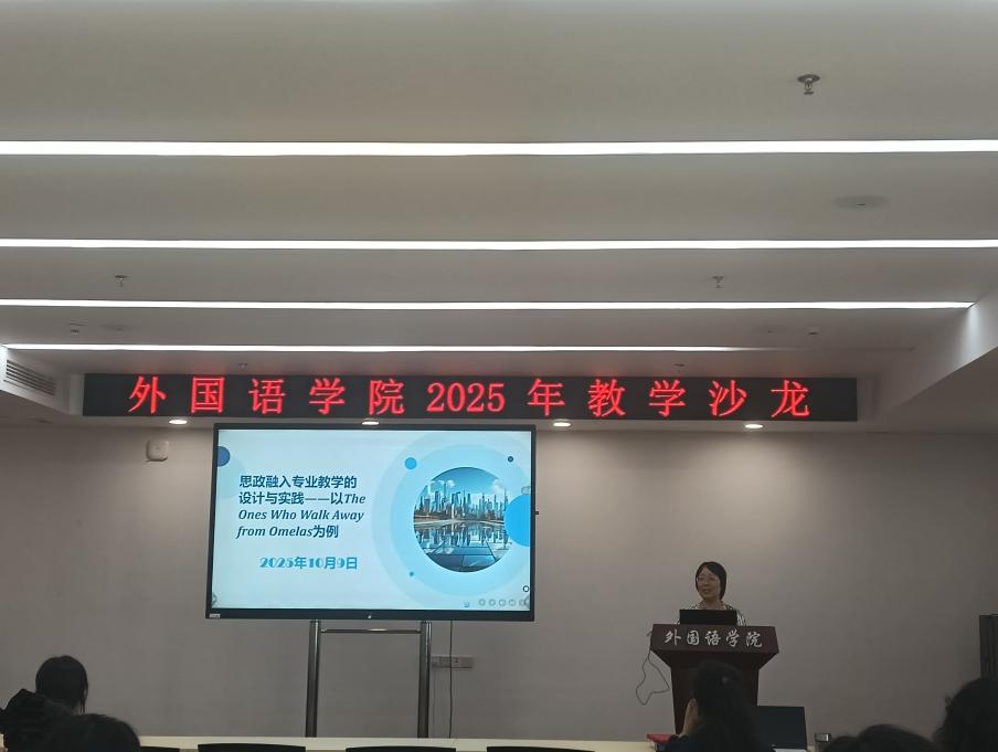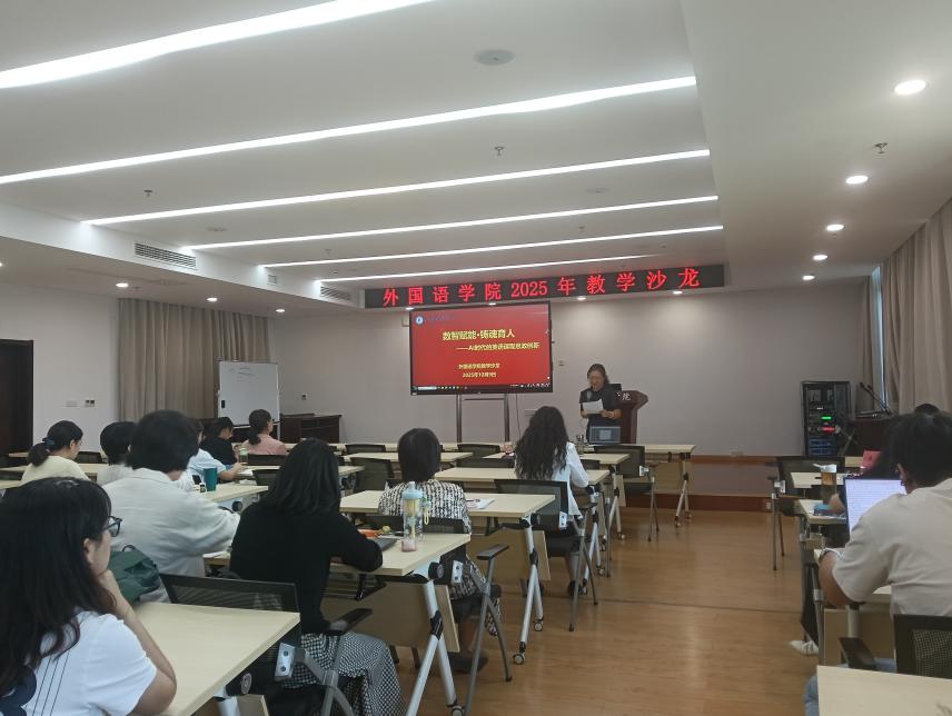 10月9日16:00,由外国语学院教师教学发展分中心与院工会联合举办的“外国语学院2025年教学沙龙”在文理楼学术报告厅举行。本次沙龙特邀今年外研社“教学之星”大赛课程思政案例专项赛国赛获奖教师蒋慧、谭方黎、雷飞围绕“数智赋能· 铸魂育人——AI时代的英语课程思政创新”主题分别从专业教学、大外教学及课程思政团队建设三个方面进行分享。学院全体教师齐聚一堂,沙龙由韩菁菁副院长主持。