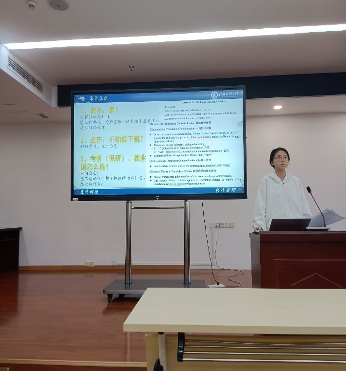 2025年10月23日,翻译系与英语系联合举办“学子新语”讲座——学业规划与考研经验分享会。本次活动由杨丽老师与吕子青老师共同主持,特邀我院2022级四位成功保研的优秀学生——龚陈烨、宗恬羽、陈佳慧、王怀玉担任分享会主讲。她们已分别被上海大学、南京理工大学、苏州大学等知名高校录取。