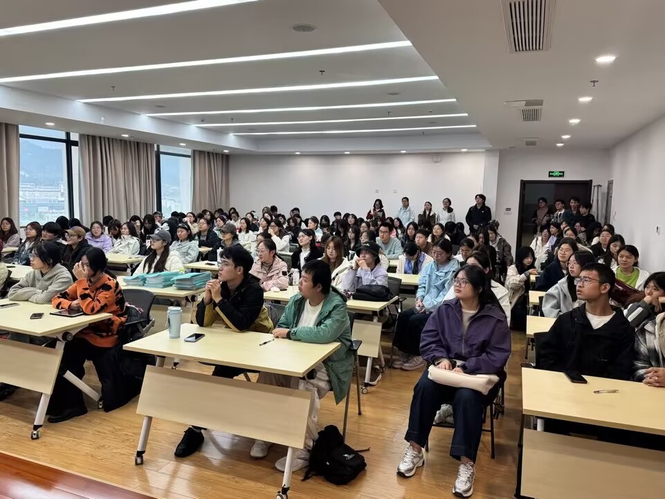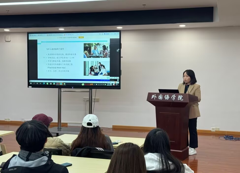 杨丽博士紧扣“为什么选择新西兰留学”这一主题,从教育体系、学制特色到就业政策进行了系统梳理。她指出新西兰硕士学制灵活,兼顾学术与职业发展,并详细解读了毕业后最长可申请三年开放工签的利好政策。紧密结合外国语学院的专业特色,她重点推荐了应用语言学、TESOL、翻译与口译等优势硕士项目,并分享了当地多元文化环境与生活细节,使同学们对“长白云之乡”的留学图景有了直观认知。
